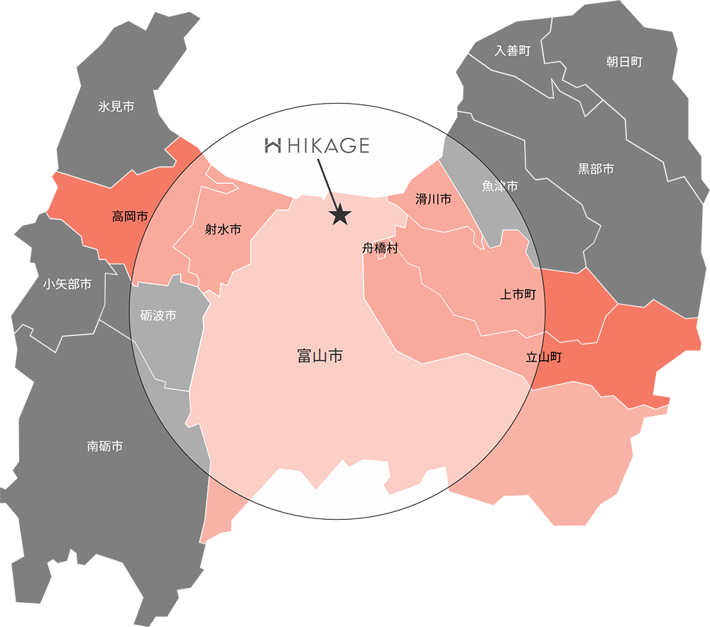 富山市を拠点に、射水市・高岡市・滑川市・上市町・立山町・舟橋村など、車で40分圏内のエリアで家づくりをお手伝いしています。