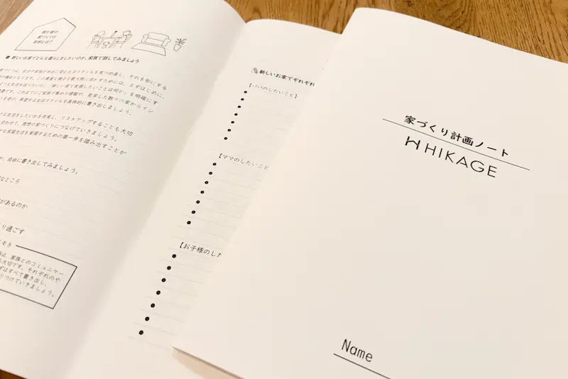 打ち合わせ内容やアイデアを書き留める専用ノート。思いついたことを記録しておくことで、あとから見返した際の気づきにもつながります。ページを重ねるごとに“わが家のストーリー”が形になっていく感覚を楽しんでいただけます。